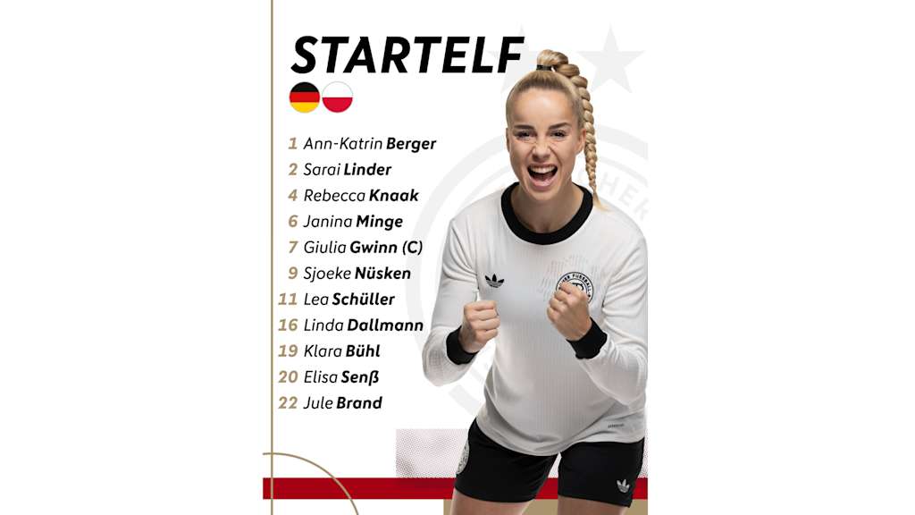 Startklar für die UEFA Women's Euro 2025: Heute (ab 21 Uhr, live in der ARD) startet die deutsche Frauen-Nationalmannschaft in St. Gallen gegen Polen ins EM-Turnier. Bundestrainer Christian Wück ändert seine Aufstellung im Vergleich zum letzten Pflichtspiel in Österreich auf vier Positionen: Linder, Nüsken, Dallmann und Brand starten statt Kett, Lohmann, Cerci und Freigang ins erste Gruppenspiel.
