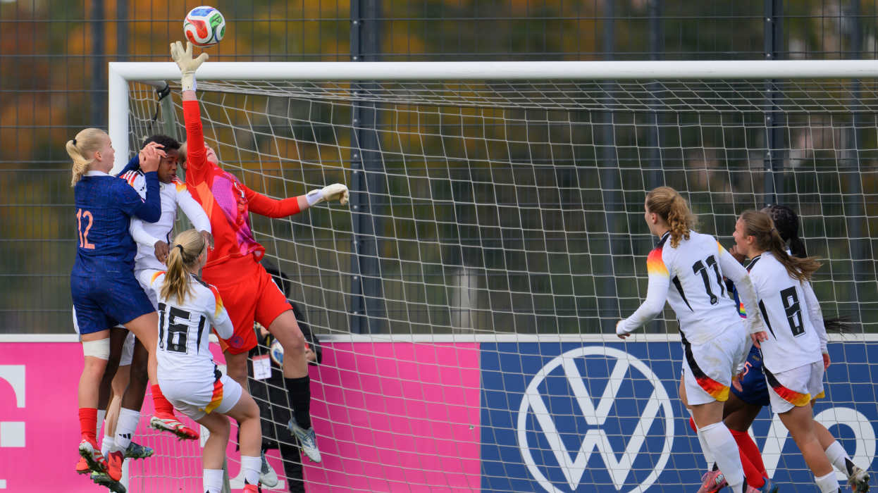 Loderer vertraute bei kühlen acht Grad in Frankfurt auf die gleiche Startelf wie beim 2:1 zum Turnierauftakt gegen Belgien im 4-4-2-System. Beide Teams agierten vorsichtig, tasteten sich zunächst ab. Erst in der 24. Minute schloss Victoria Säring (TSG Hoffenheim) erstmals ab. Deutschland agierte nun druckvoller, kam durch Mariann Noack (30., Union Berlin) und Laura Dafinger (38., Bayern München) zu weiteren Möglichkeiten. Mirja Kropp (RB Leipzig) im deutschen Tor wurde in Hälfte eins nicht einmal geprüft. Odélia Taes Abschluss verfehlte den Kasten (36.).