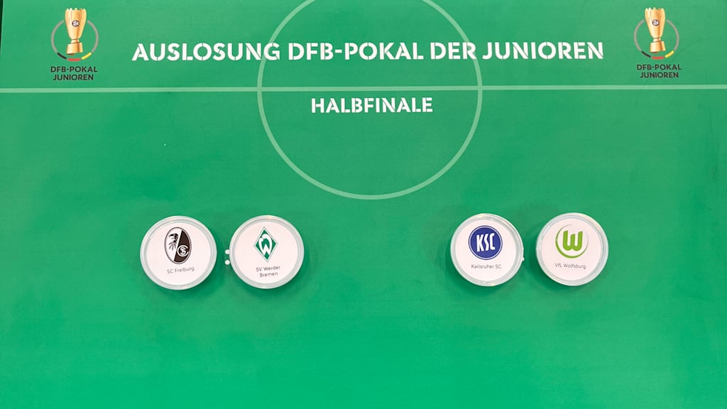 Der genaue Fahrplan für die verbliebenen vier Teams im Halbfinale um den DFB-Pokal der Junioren steht fest: Rekordsieger SC Freiburg, der in der Vorsaison erst im Endspiel gegen die TSG Hoffenheim seinen siebten Pokalerfolg verpasst hatte, bekommt es mit dem Nachwuchs des SV Werder Bremen zu tun, der bei seiner fünften Halbfinalteilnahme erstmals ins Endspiel vorrücken will. Außerdem trifft die U 19 des Karlsruher SC auf den VfL Wolfsburg.