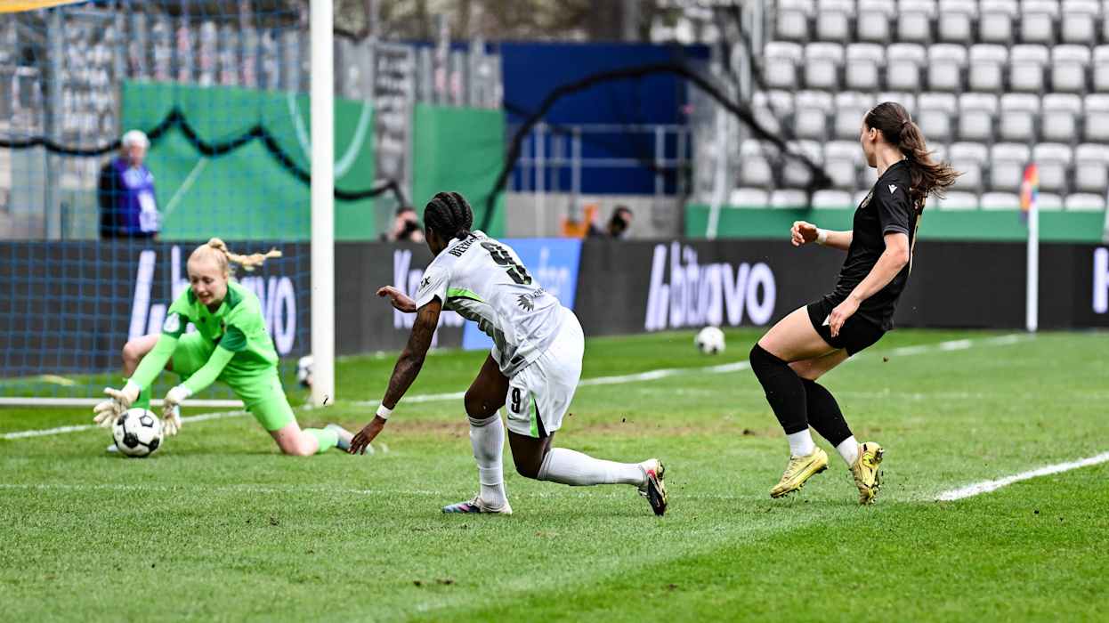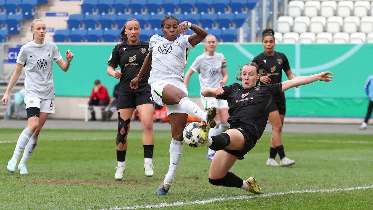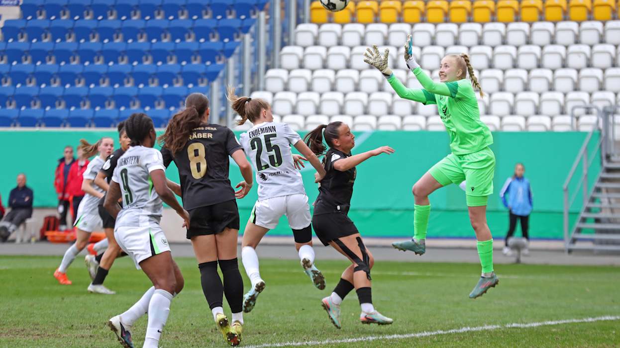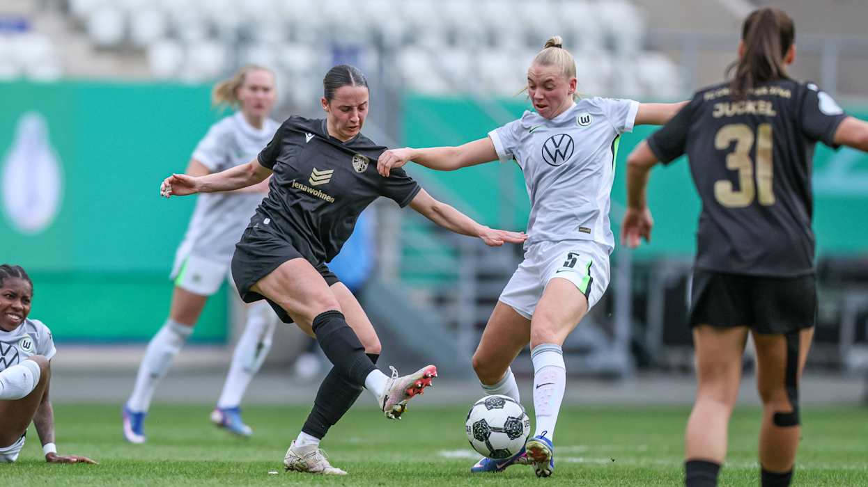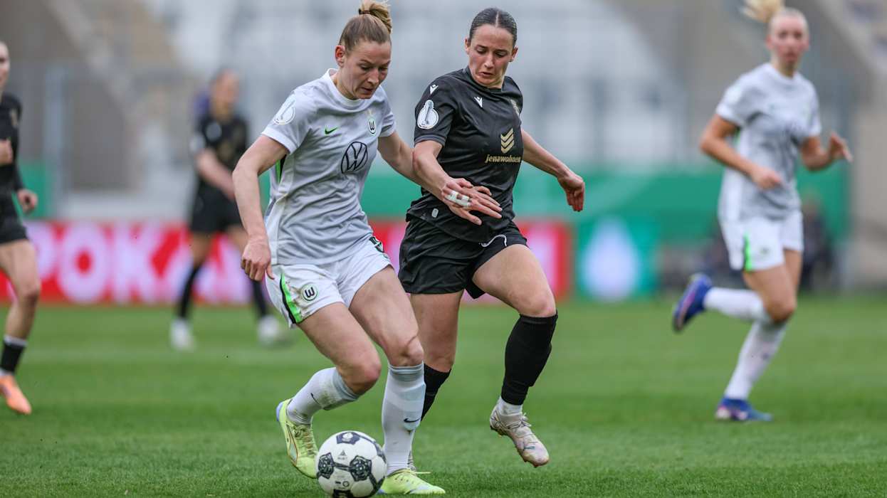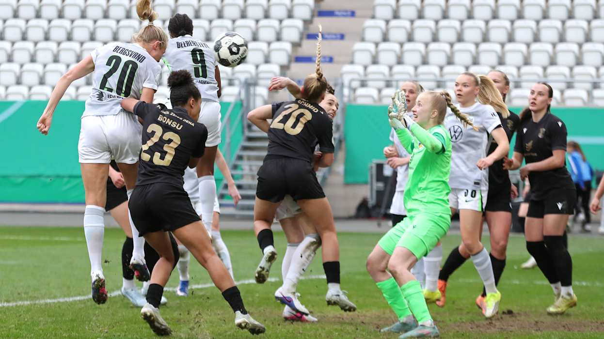 Rekordpokalsieger VfL Wolfsburg hat das erste Ticket für das Finale des DFB-Pokals der Frauen gelöst. In einem umkämpften Halbfinale am Ostersonntag setzten sich die Wölfinnen beim FC Carl Zeiss Jena vor 2114 Zuschauenden mit 5:4 (0:0) im Elfmeterschießen durch.