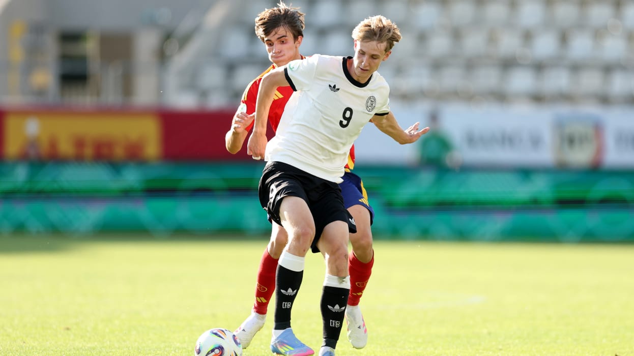 Mit Co-Trainer Pascal Pellowski an der Seitenlinie startete Deutschland besser in die Partie und hatte nach vier Minuten gleich die erste Torchance. Assan Ouedraogo drang über die rechte Seite in den spanischen Strafraum ein und brachte den Ball in den Rückraum, wo Paris Brunner die Kugel aufs Tor brachte. Andres Cuenca blockte den Schuss allerdings vor der Linie noch an die Latte. Anschließend übernahm Spanien das Spiel vor 1232 Zuschauer*innen in Bukarest, kam aber an der kompakten deutsche Abwehr nicht vorbei. Die DFB-Auswahl befreite sich einige Male und holte eine Ecke heraus, die Brunner knapp am Tor vorbei köpfte (16.).