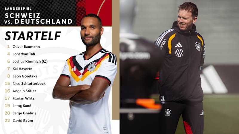 Beim Jahresauftakt der Nationalmannschaft heute (ab 20.45 Uhr) in Basel gegen die Schweiz setzt Bundestrainer Julian Nagelsmann auf folgende Startelf: Baumann - Tah, Kimmich (C), Havertz, Goretzka, Schlotterbeck, Stiller, Wirtz, Sané, Gnabry, Raum.