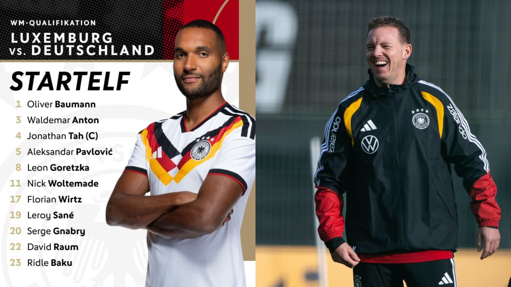 Bundestrainer Julian Nagelsmann nimmt für das heutige WM-Qualifikationsspiel (ab 20.45 Uhr, live bei RTL) der deutschen Nationalmannschaft in Luxemburg drei Änderungen im Vergleich zum letzten Pflichtspiel gegen Nordirland vor. Für den angeschlagenen Joshua Kimmich übernimmt Jonathan Tah das Kapitänsamt. Ridle Baku und Leroy Sane rücken für Nico Schlotterbeck und Karim Adeyemi in die Anfangsformation.