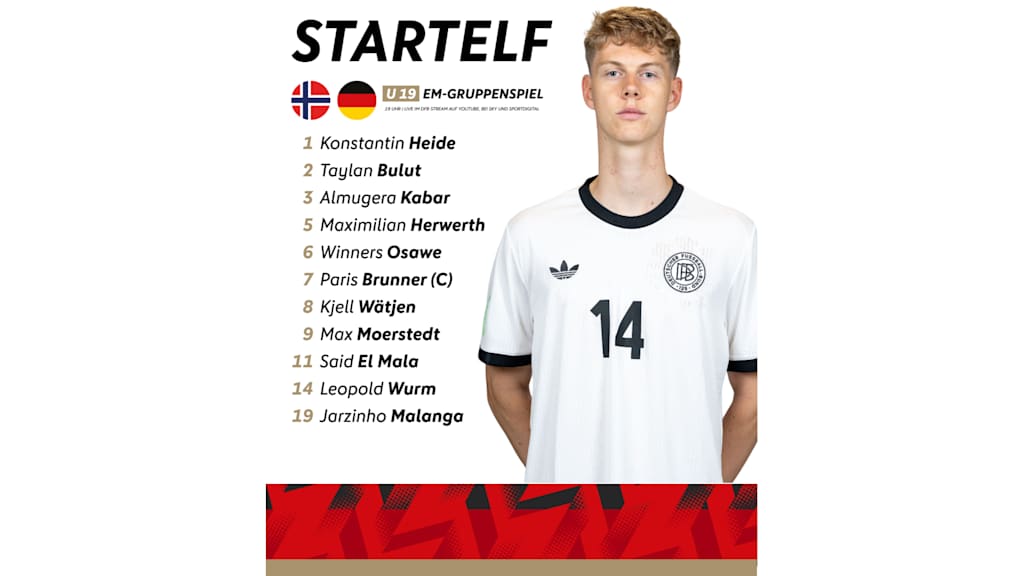 Heute (ab 19 Uhr, live und kostenlos auf Sky) spielt die deutsche U 19-Nationalmannschaft ihr letztes Gruppenspiel der Europameisterschaft gegen Norwegen. Im Vergleich zum 5:5 gegen England wechselt DFB-Trainer Hanno Balitsch auf der Stürmerposition: Jarzinho Malanga startet für Kapitän Noah Darvich. Paris Brunner führt die deutsche Mannschaft als Spielführer auf das Feld.