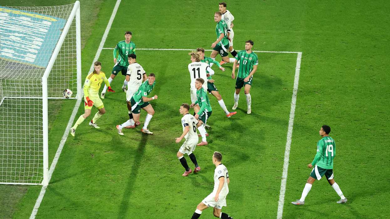 Dies war aber der imaginäre Startschuss für den dreimaligen WM-Teilnehmer, der nun auch offensiv häufiger in Erscheinung trat. Das DFB-Team kam auf der anderen Seite durch einen Distanzschuss aus 18 Metern von Aleksandar Pavlovic, der knapp am Lattenkreuz vorbeizischte, zu einer ersten guten Torszene (20.). Die Partie fand mit vielen intensiven Zweikämpfen aber zumeist in der Mitte des Spielfeldes statt, was auf beiden Seiten zulasten eines geordneten Spielaufbaus und gefährlicher Torszenen ging. Für den ersten deutschen Treffer musste also eine Standardsituation herhalten: Nach einem präzisen Eckstoß von David Raum setzte sich Woltemade im Zentrum gegen zwei Gegenspieler durch und drückte den Ball mit der Schulter und purem Willen ins lange Eck über die Linie (31.).