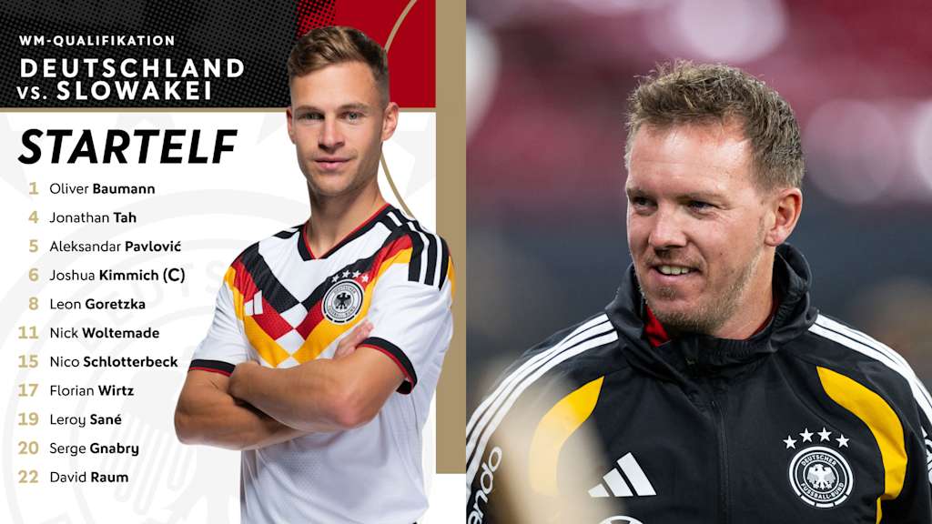 Im abschließenden WM-Qualifikationsspiel der deutschen Nationalmannschaft in Leipzig gegen die Slowakei (ab 20.45 Uhr, live im ZDF) nimmt Bundestrainer Julian Nagelsmann zwei Änderungen im Vergleich zum Auswärtsspiel in Luxemburg vor. Kapitän Joshua Kimmich und Innenverteidiger Nico Schlotterbeck kehren für Ridle Baku und Waldemar Anton zurück in die Anfangsformation.