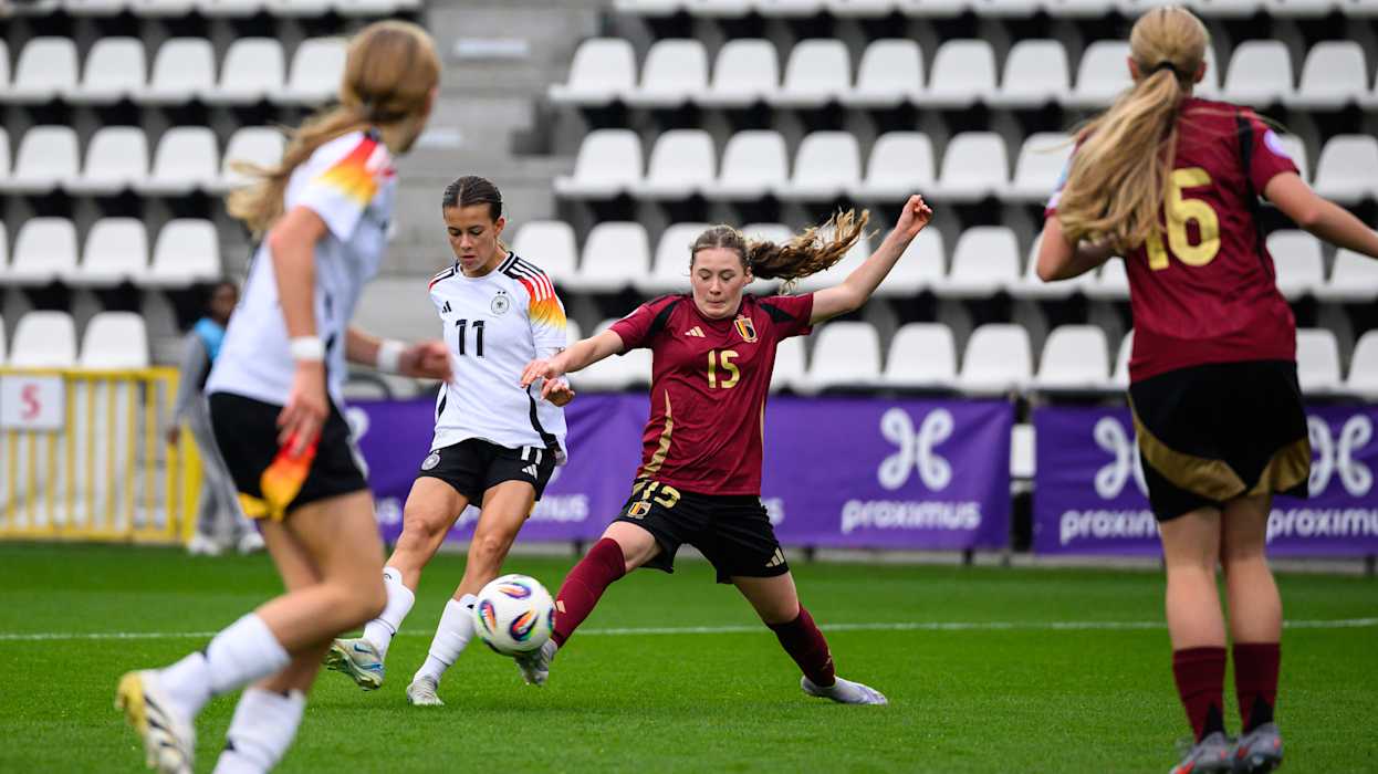 Die deutsche Auswahl startet forsch und offensivfreudig in die Partie, ohne sich jedoch durchschlagen zu können und sich Torchancen herauszuspielen. Nach den ersten Minuten kamen auch die "Red Flames" besser ins Spiel und übernahmen zeitweise die Spielkontrolle. In der 13. Minute brachten die Gastgeberinnen Leonie Dalming zum Fliegen, die erste Parade für die DFB-Keeperin. Fünf Minuten später musste sie den nächsten Schuss aus zentraler Position abwehren. In der nächsten Aktion war Dalming aber ohne Chance: Einen unglücklicher Rückpass nutzte Clara van Laethem, umkurvte die deutsche Torfrau und schob zur Führung ein (21.).