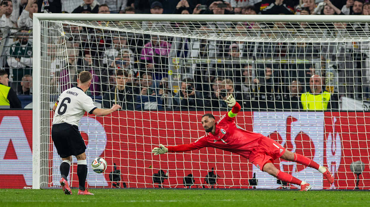 Immer wieder spielte sich das DFB-Team nach vorne und wurde schließlich belohnt. Nach einer schnellen Kombination schickte Goretzka Kleindienst steil auf die rechte Seite des Strafraums. Der Stürmer kam an den Ball, wurde dann aber vom italienischen Verteidiger Alessandro Buongiorno gefoult, sodass dem polnischen Schiedsrichter Marciniak nichts anders übrig blieb, als auf Elfmeter zu entscheiden. Kapitän Kimmich übernahm Verantwortung – und versenkte den Strafstoß souverän unten links (30.).