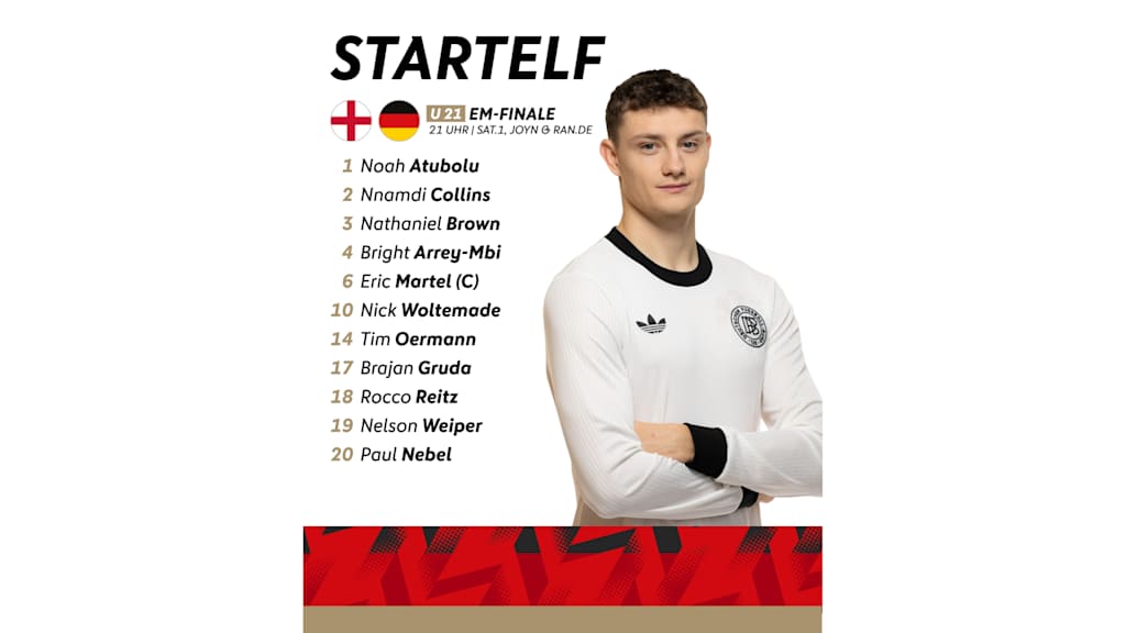 Das Warten hat ein Ende: Die deutsche U 21-Nationalmannschaft spielt heute (ab 21 Uhr, live in SAT.1, auf Joyn und ran.de) im Finale von Bratislava gegen England um den vierten EM-Titel. DFB-Trainer Antonio Di Salvo nimmt zwei Änderungen in seiner Startaufstellung im Vergleich zum Halbfinalsieg über Frankreich vor: Tim Oermann und Brajan Gruda beginnen für Ansgar Knauff und Max Rosenfelder, der verletzungsbedingt nicht im Kader steht.