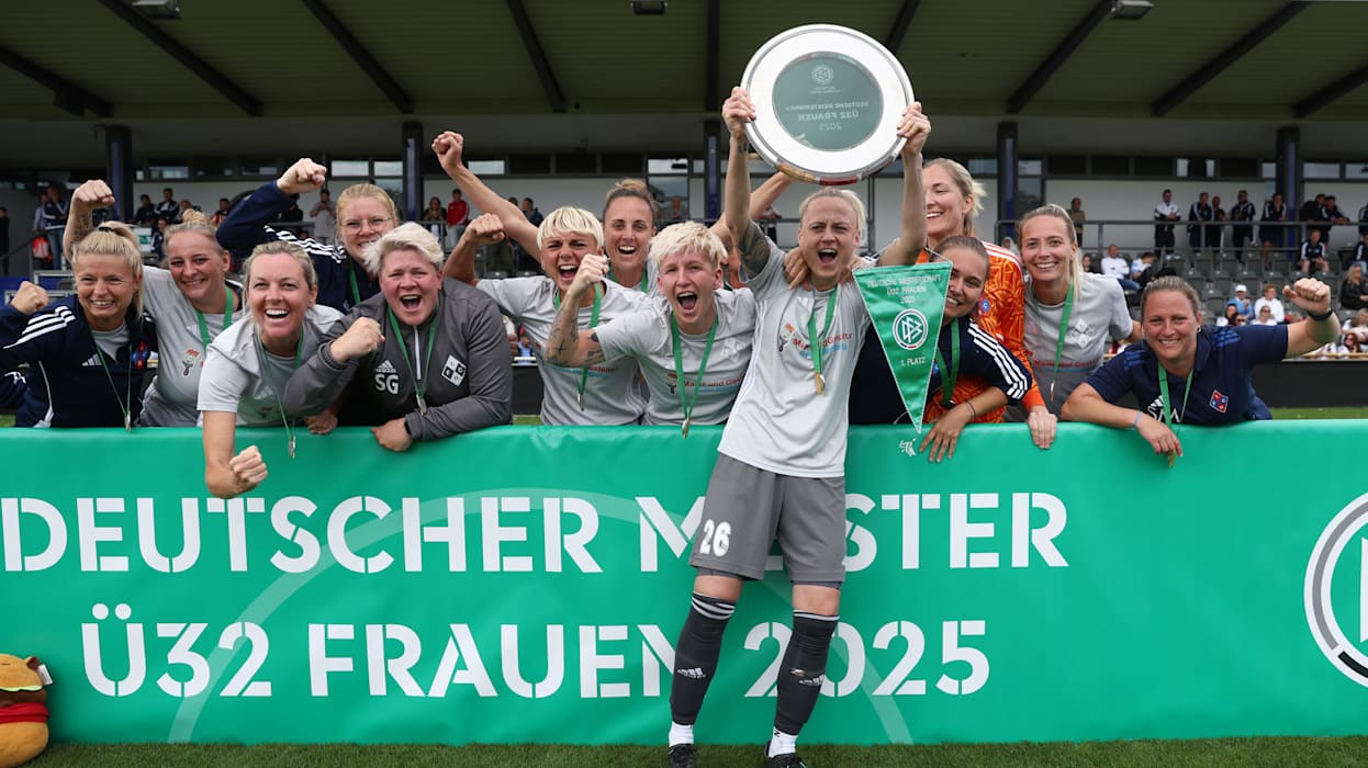 Der 1. FC Riegelsberg ist Deutscher Ü 32-Meister der Frauen. Von den fünf Meisterschaftsspielen, die am Wochenende in Berlin ausgetragen wurden, gewann Riegelsberg vier Partien und verpasste nur knapp die volle Ausbeute. Lediglich gegen Türkiyemspor Berlin kam es zu einem 0:0-Unentschieden. Die Hauptstädterinnen waren zugleich der größte Konkurrent des neuen Meisters und belegten mit 11 Punkten den zweiten Platz. Dahinter folgten die Ü 32-Frauen des FC Bayern München. Chancenlos blieb die SG 99 Andernach, die mit nur vier Punkten den letzten Rang belegte.
