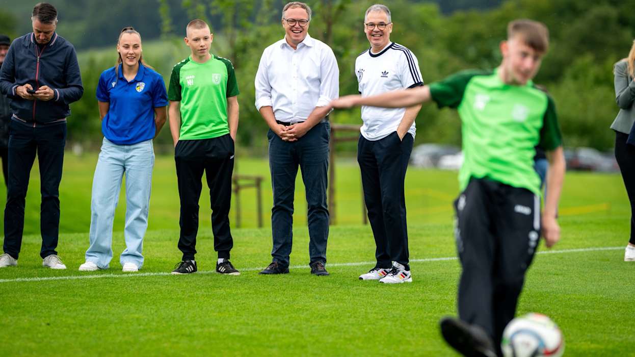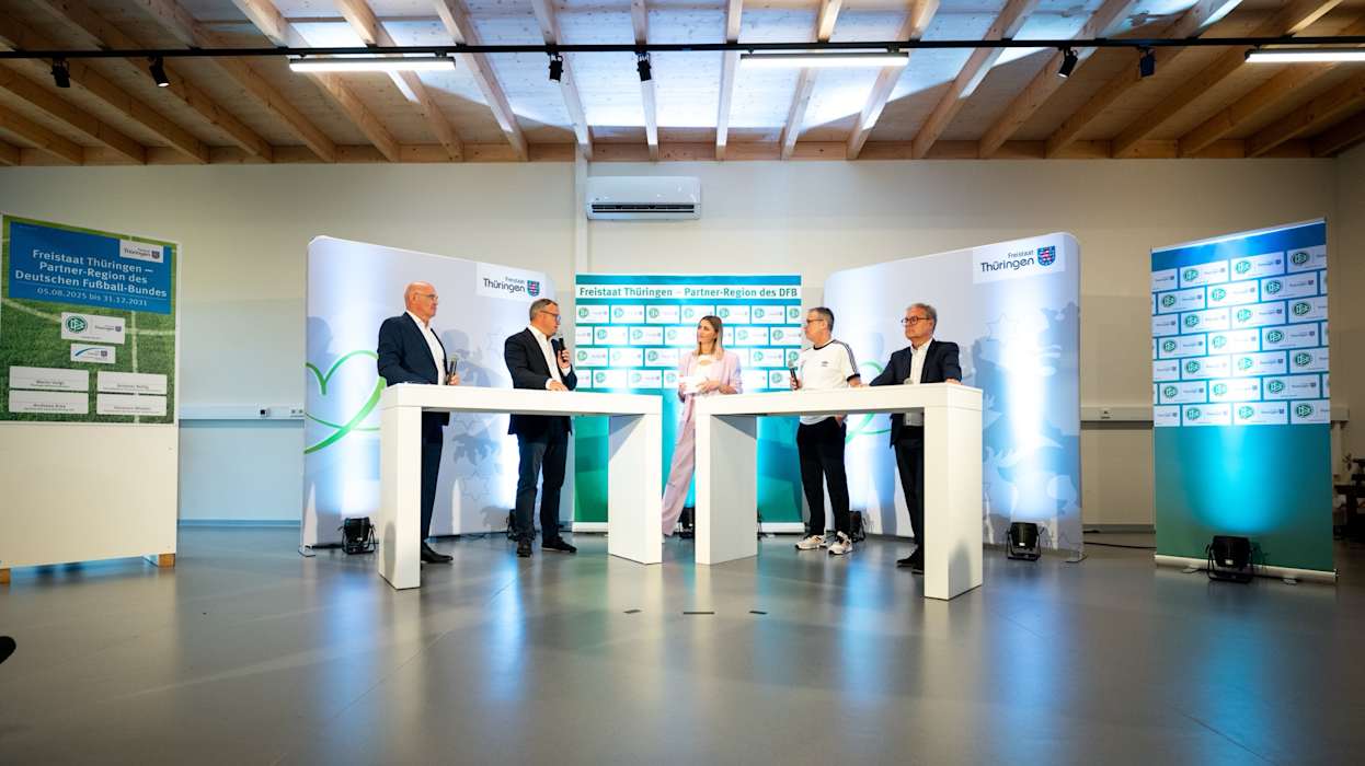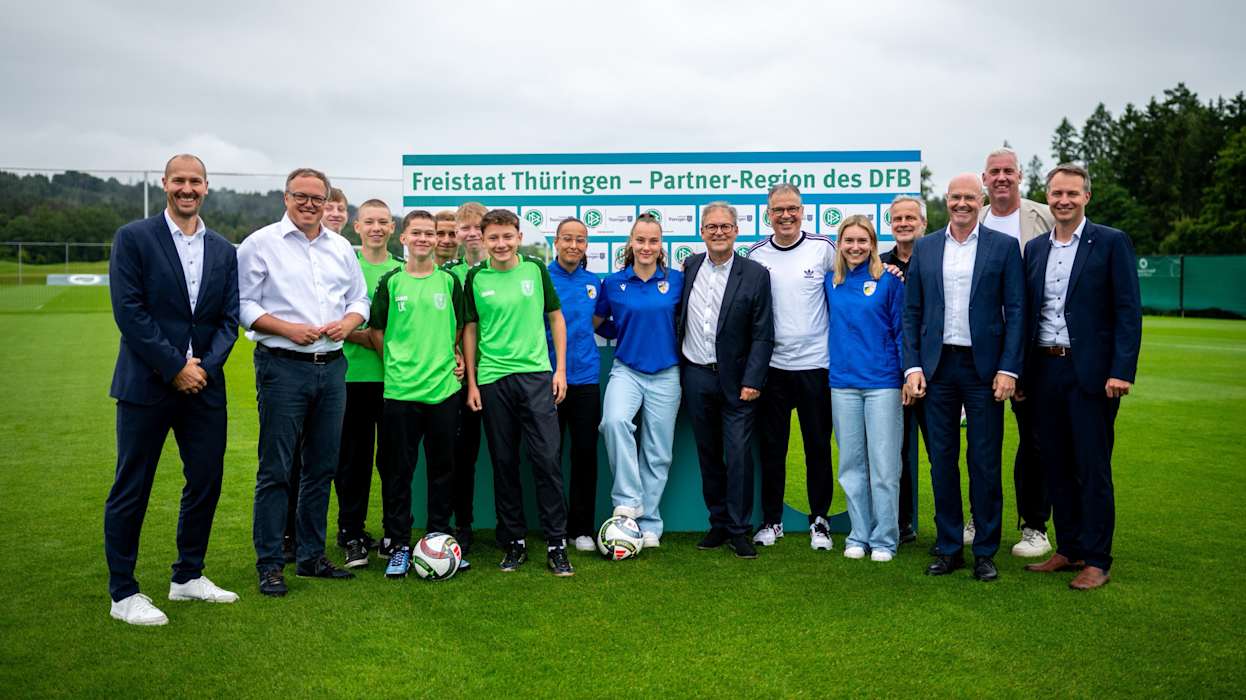 Der Freistaat Thüringen ist ab sofort Partner-Region des Deutschen Fußball-Bundes (DFB). Das gaben der DFB und die Landesentwicklungsgesellschaft Thüringen (LEG) heute bei einem Medientermin mit Ministerpräsident Mario Voigt, DFB-Geschäftsführer Sport Andreas Rettig und DFB-Vizepräsident Hermann Winkler in Blankenhain bekannt. Auswahlmannschaften des DFB sollen sich künftig unter anderem auch in Thüringen auf Länderspiele oder Turniere vorbereiten können. Der Kooperationsvertrag läuft zunächst bis zum 31. Dezember 2031 und umfasst die A-Nationalmannschaften der Frauen und Männer, die U 20- und U 23-Nationalmannschaften der Frauen, die U 21-Nationalmannschaft der Männer sowie weitere Teams des DFB.