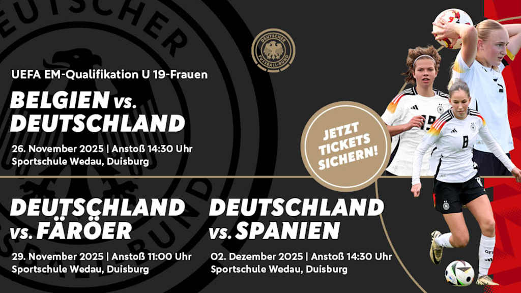 Für die U 19-Frauen-Nationalmannschaft steht die erste EM-Qualifikationsrunde an. In Duisburg trifft die Mannschaft von Melanie Behringer auf die Teams aus Belgien, den Faröern und Spanien. Karten für die Partien mit deutscher Beteiligung gibt es weiterhin im DFB-Ticketportal.