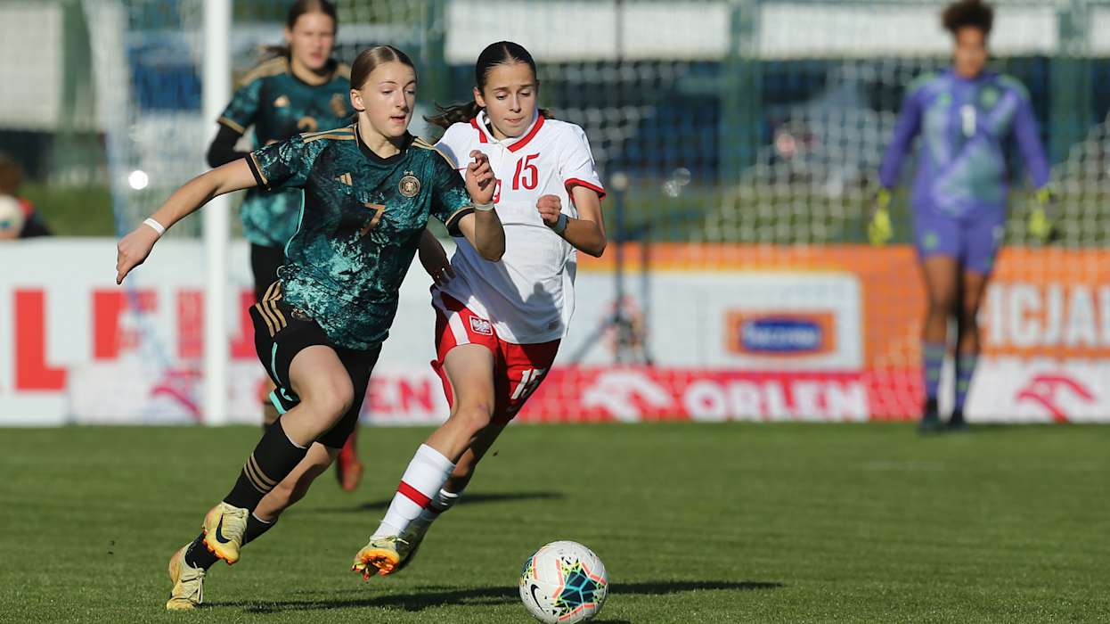 In der Anfangsviertelstunde agierte die deutsche Mannschaft sehr nervös, da die Polinnen sehr druckvoll spielten. In der 16. Spielminute ging die polnische Auswahl dann mit 1:0 in Führung. Nach einem schönen Steckpass durch die deutsche Abwehrreihe umkurvte die polnische Stürmerin Maja Grzechnik DFB-Torhüterin Selina Großer und schob mühelos zur Führung ein.