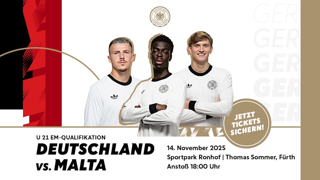 In der letzten Länderspiel-Abstellung im Jahr 2025 stehen für die U 21-Nationalmannschaft noch einmal zwei Qualifikationsspiele zur EM 2027 in Albanien und Serbien an. Bevor die Mannschaft von Cheftrainer Antonio Di Salvo zum Auswärtsspiel nach Georgien am Dienstag, 18. November (ab 18 Uhr live in SAT.1), reist, trifft das deutsche Team im Sportpark Ronhof I Thomas Sommer in Fürth am Freitag,14. November (ab 18 Uhr, live in SAT.1), auf Malta.