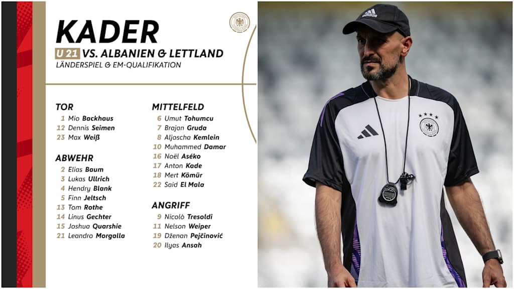 "Unsere Vorfreude ist sehr groß, weil der Prozess, eine Mannschaft neu zu formen und die Spieler persönlich kennenzulernen, immer sehr spannend ist", sagt der DFB-Trainer. "Die Mischung aus bereits erfahrenen U 21-Akteuren und neuen Spielern ist gut. Jetzt geht es darum, schnell zu einer Einheit zusammenzuwachsen und erfolgreich in die EM-Qualifikation zu starten. In Albanien werden wir ein Testspiel haben und erste Erkenntnisse bekommen."