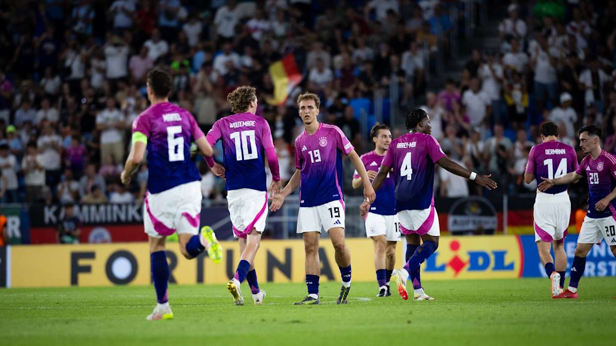 Und Deutschland fand immer besser ins Spiel. Eine Ecke von Reitz rauschte einmal an der Spielertraube im Fünfmeterraum vorbei, fand dafür aber Nebel mit viel Platz auf der anderen Seite. Den nutzte der Mainzer für einen Schlenker und schweißte die Kugel in den Winkel zum Ausgleich (61.). In der Folge beruhigte sich das Spieltempo etwas, Ballgewinne wurden schnell mit Fouls unterbunden. Di Salvo nutzte die Phase und wechselte erstmals: Ansgar Knauff ersetzte Gruda (73.).