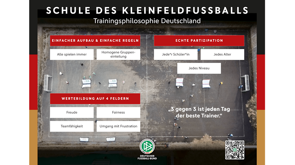 Die „Schule des Kleinfeldfußballs“ wurde speziell für Schulen entwickelt und baut auf der "Trainingsphilosophie Deutschland" auf. Durch das Konzept sollen alle Kinder und Jugendliche imvolviert sein – auch die, die sonst im Unterricht wenig eingebunden sind. Für die Umsetzung braucht es nicht viel. Das Spielen im 3-gegen 3 fördert die Kinder effektiver und kindgerechter auf ihrem Leistungsniveau - ob beim Fußball, Handball, Basketball oder Hockey.