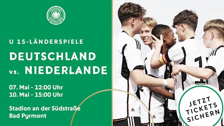 Die deutsche U 15-Junioren-Nationalmannschaft bestreitet im Mai zwei Länderspiele im Rahmen eines Drei-Nationen-Turniers in der Sportschule Wedau in Duisburg. Fans können nun Tickets für die Partien gegen die Niederlande und Belgien kaufen.