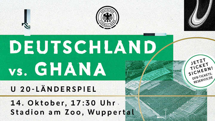 Am 14. Oktober (17.30 Uhr) empfängt die deutsche U 20-Nationalmannschaft Ghana im Stadion am Zoo in Wuppertal. Karten kosten drei und 13 Euro und sind nun im DFB-Ticketshop erhältlich. Alle Infos dazu gibt es hier - einfach reinklicken.